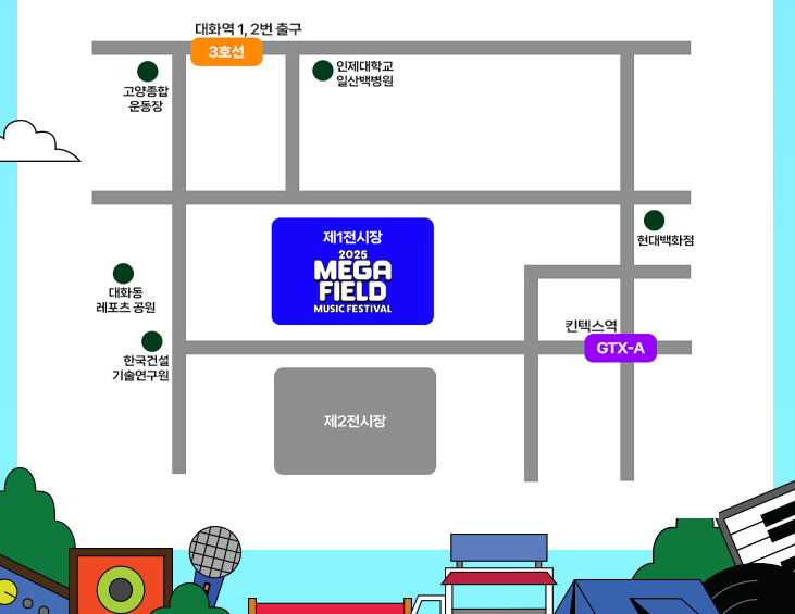 메가필드뮤직페스티벌이 열리는 킨텍스는 교통 접근성이 좋은 편입니다. 하지만 공연 당일에는 많은 인파가 몰릴 수 있으니 미리 교통편을 확인하는 것이 좋습니다.