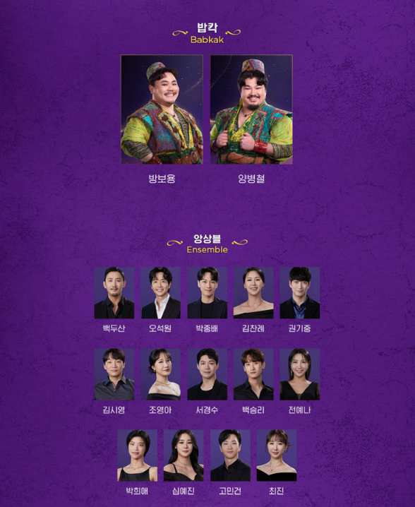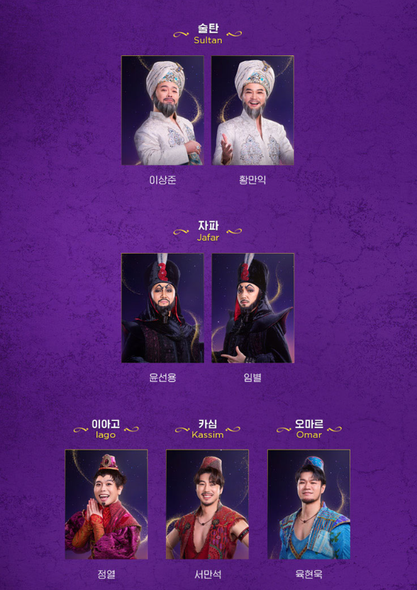 이번 한국 초연에는 국내 최고의 배우들이 총출동합니다! 알라딘, 지니, 자스민 등 주요 캐릭터를 맡은 배우들을 만나볼까요?