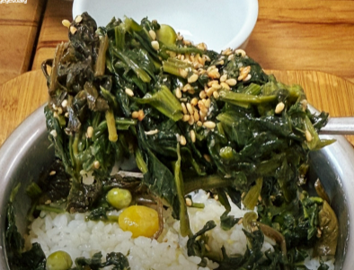 따뜻한 밥 위에 숙성된 산나물을 올리고 참기름과 최소한의 고추장만 더해 비비면 문경밥상 발효산나물밥상에서 느꼈던 담백함에 가까워진다.