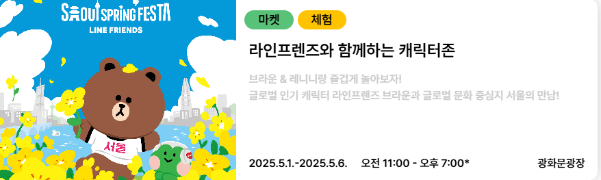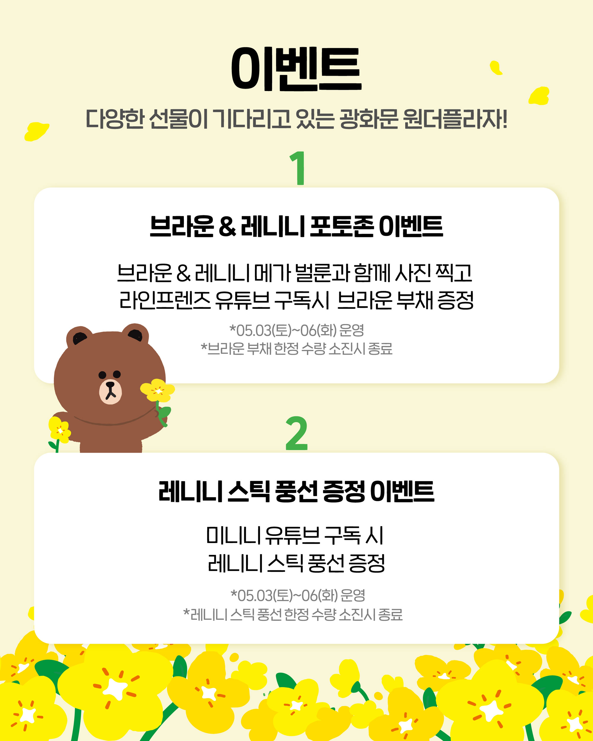 글로벌 인기 캐릭터 라인프렌즈 브라운과 글로벌 문화 중심지 서울의 만남! 광화문 원더플라자에서는 대형 포토존을 비롯해 다양한 이벤트가 진행되며, 어린이날을 기념해 서울의 밤하늘을 별처럼 수놓는 라인프렌즈 드론 라이트 쇼가 여러분 앞에 펼쳐집니다. 따뜻한 봄날 라인프렌즈와 함께 잊지 못할 순간을 만들어 보세요.