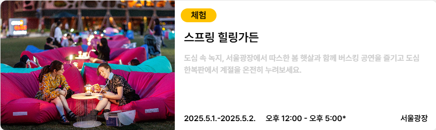 도심 속 잔디밭 위에서 따스한 봄 햇살과 함께 즐기는 힐링타임! ‘서울라이브구석구석’의 감성 가득 버스킹 공연과 함께, 가족 모두가 즐길 수 있는 봄날의 힐링 프로그램에 여러분을 초대합니다!