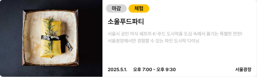 봄밤에 어울리는 감미로운 공연과 함께 미쉐린 그린 스타에 선정된 서울 미식 레스토랑의 K-푸드를 도심 속에서 즐기는 특별한 만찬! 서울스프링페스타 소울푸드파티에 여러분을 초대합니다.
