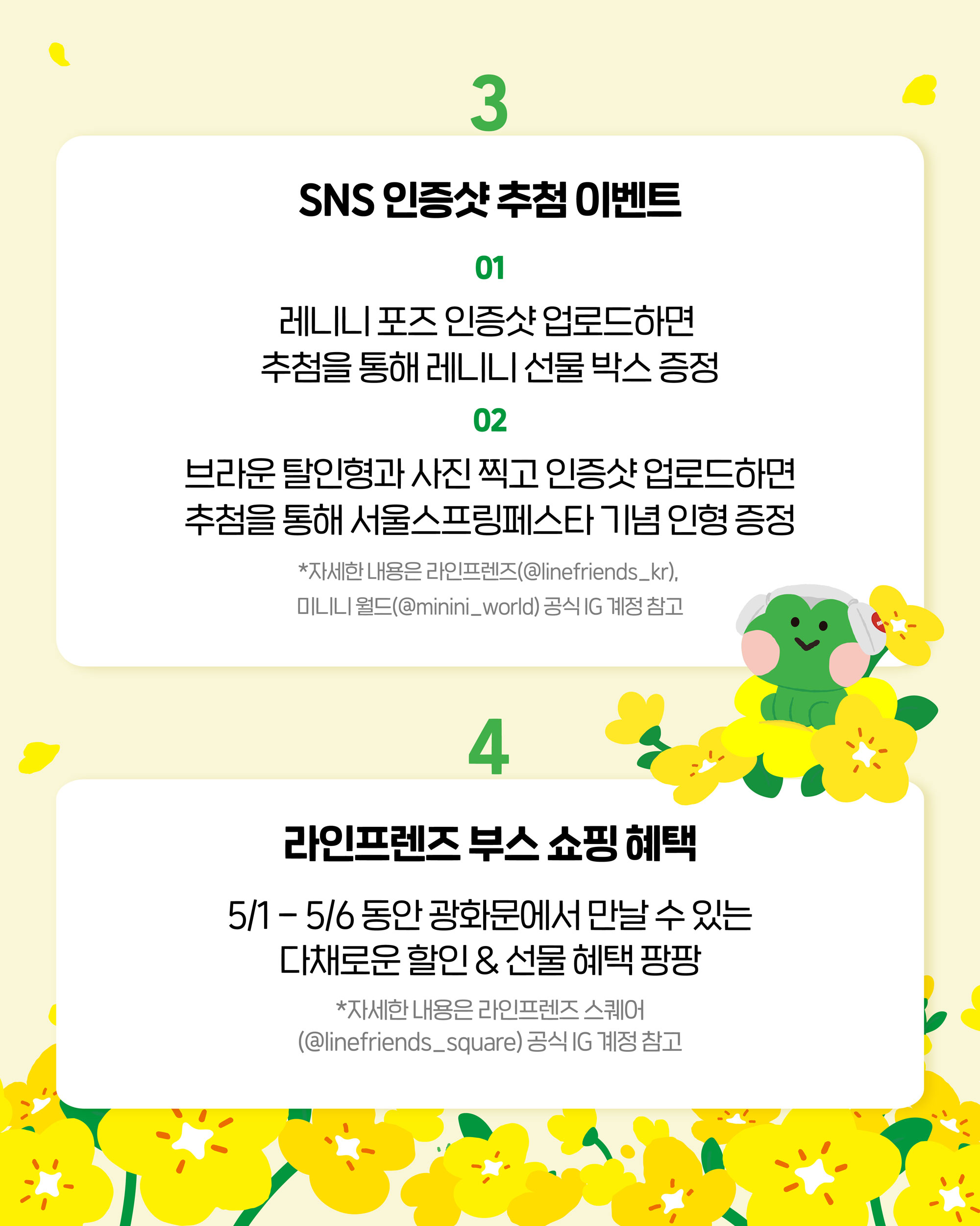 글로벌 인기 캐릭터 브라운과 레니니가 광화문광장에 등장합니다! 따뜻한 봄날, 도심 한복판에서 라인프렌즈와 함께하는 대형 포토존에서 잊지 못할 순간을 사진으로 남겨보세요.