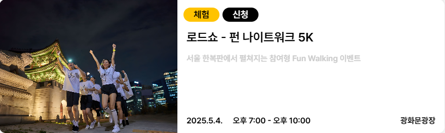 광화문광장에서 시작해 경복궁과 청와대 앞까지 달리는 Fun Night Walk 5K가 5월 4일 밤, 서울 도로 위에서 펼쳐집니다.