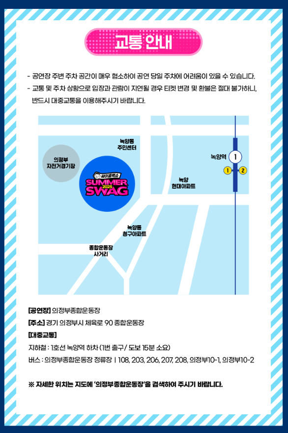 의정부종합운동장은 대중교통 접근성이 좋은 편입니다. 대규모 인파가 몰리는 공연 당일에는 대중교통 이용을 적극 권장합니다.
