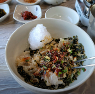 대표 메뉴인 자연산 모듬 물회는 그날그날 가장 좋은 포항 제철 수산물로 구성된다. 한 그릇 안에 바다의 풍경이 담겨 있다고 해도 과언이 아니다. 포항 제철 수산물의 신선함을 가장 직관적으로 느낄 수 있는 메뉴다.