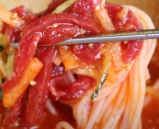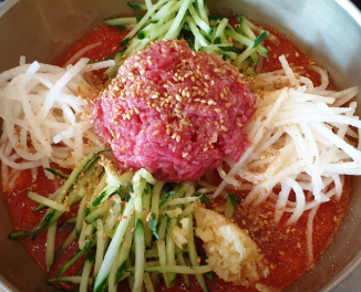 - 그릇에 소면 또는 밥을 담고 그 위에 채 썬 오이, 배, 양파, 쌈 채소, 그리고 육회를 보기 좋게 올립니다.