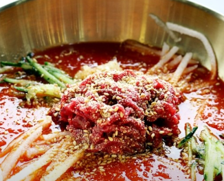생과일을 넣어 맛을 낸 새콤달콤하고 시원한 육수는 무더운 여름철 더위를 식히기에 완벽하며, 신선한 한우 육회와 만나 환상의 조화를 이룹니다.