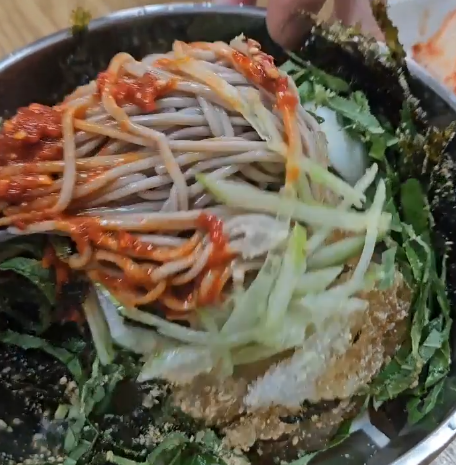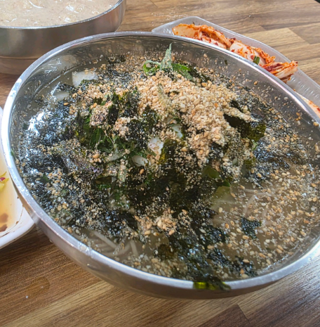 멸치 육수를 베이스로 하여 깔끔하면서도 깊은 맛을 자랑하며, 함께 들어간 채소와 김가루는 풍미를 더합니다.