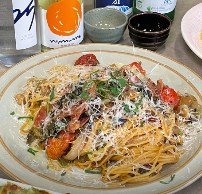 - 팬에 마늘을 볶고 새우를 넣어 익힌다.