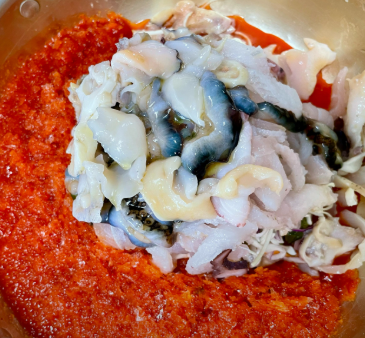 첫째, 더덕을 갈아 넣은 특제 육수입니다. 일반적인 물회 육수와는 달리 더덕이 들어가 비린 맛을 완벽하게 잡아주면서도 은은한 향과 깊은 맛을 더해줍니다. 이 육수가 오부자냄비물회 냄비물회 의 핵심이죠.