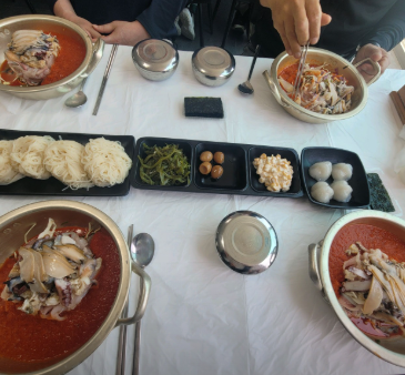 - 삶은 소면이나 따뜻한 밥을 함께 제공하여 기호에 맞게 넣어 비벼 먹습니다. 마지막에 통깨를 뿌려주면 더욱 고소합니다. 나만의 특별한 냄비물회 완성!